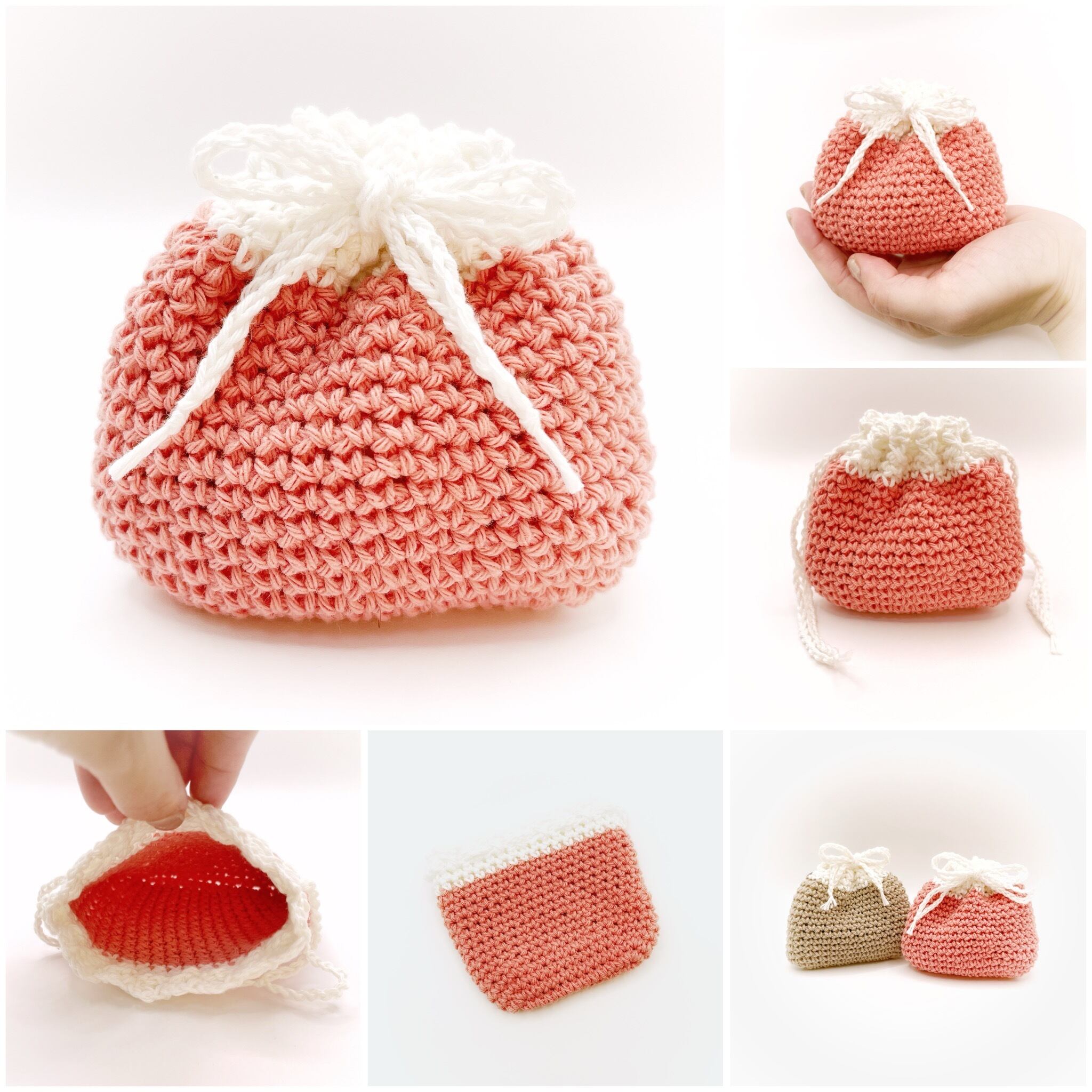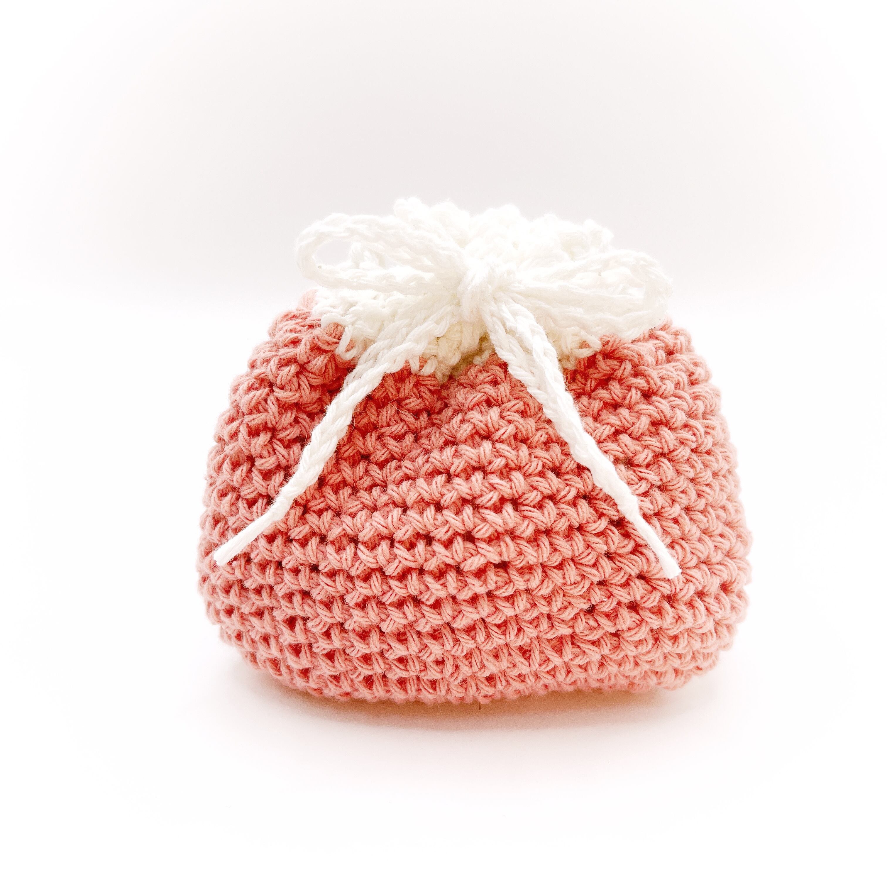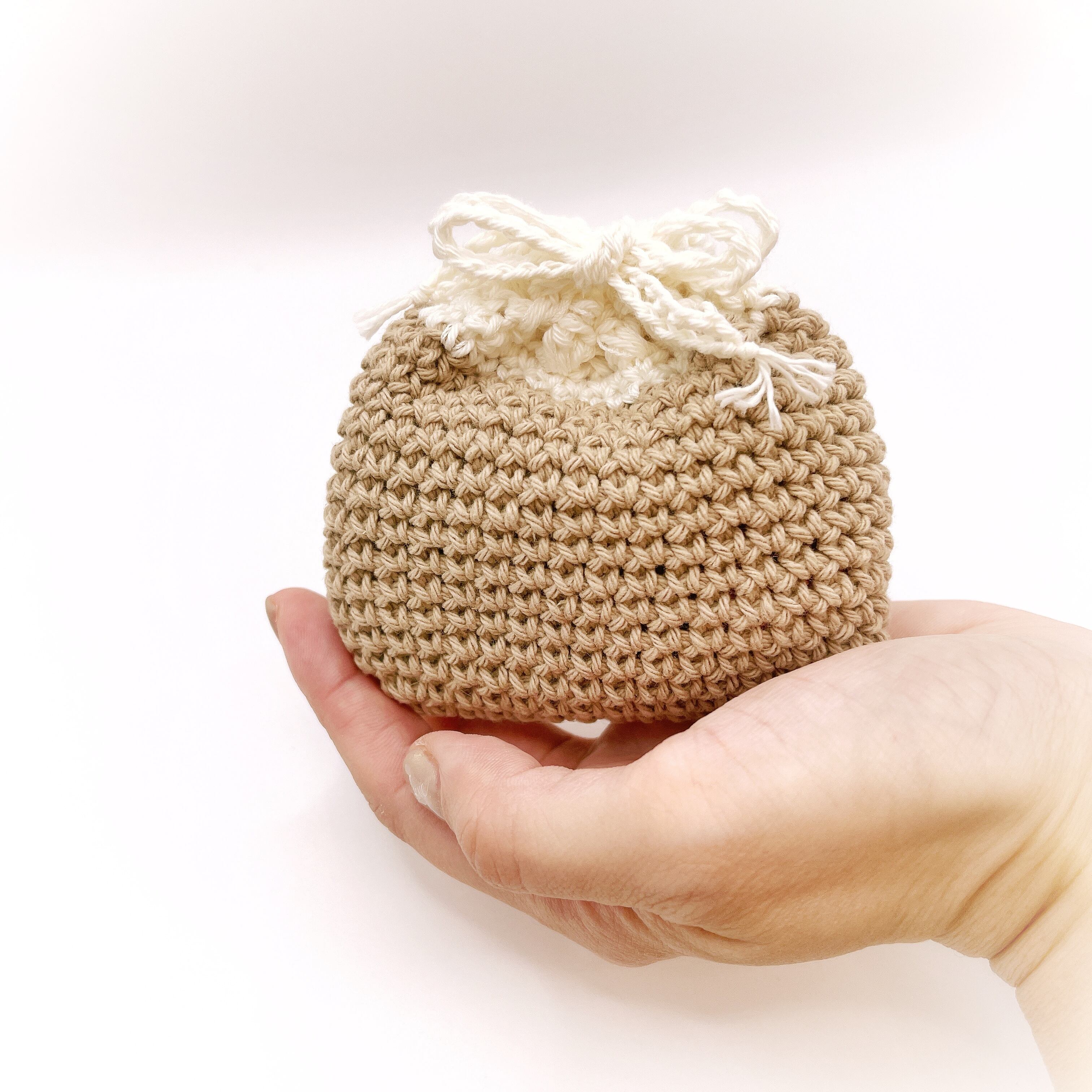 3色の優しい色合いのコットンで編んだ、小さめの巾着袋です。