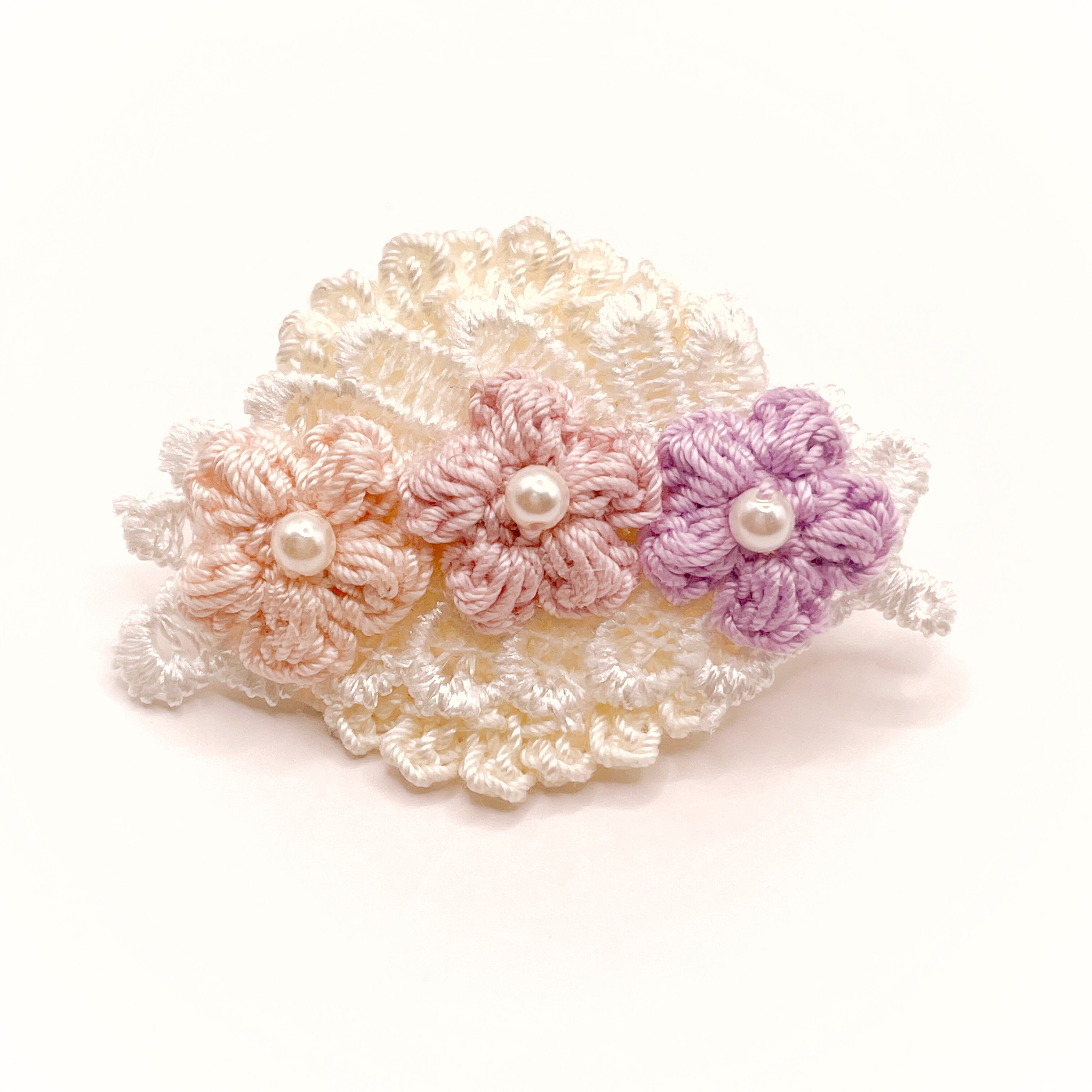 上質なレース糸で編んだ、中央にパールを添えた3色の小さなお花のブローチです。