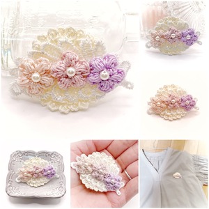 3色の小さなお花に、レースのリーフを添えたブローチです。