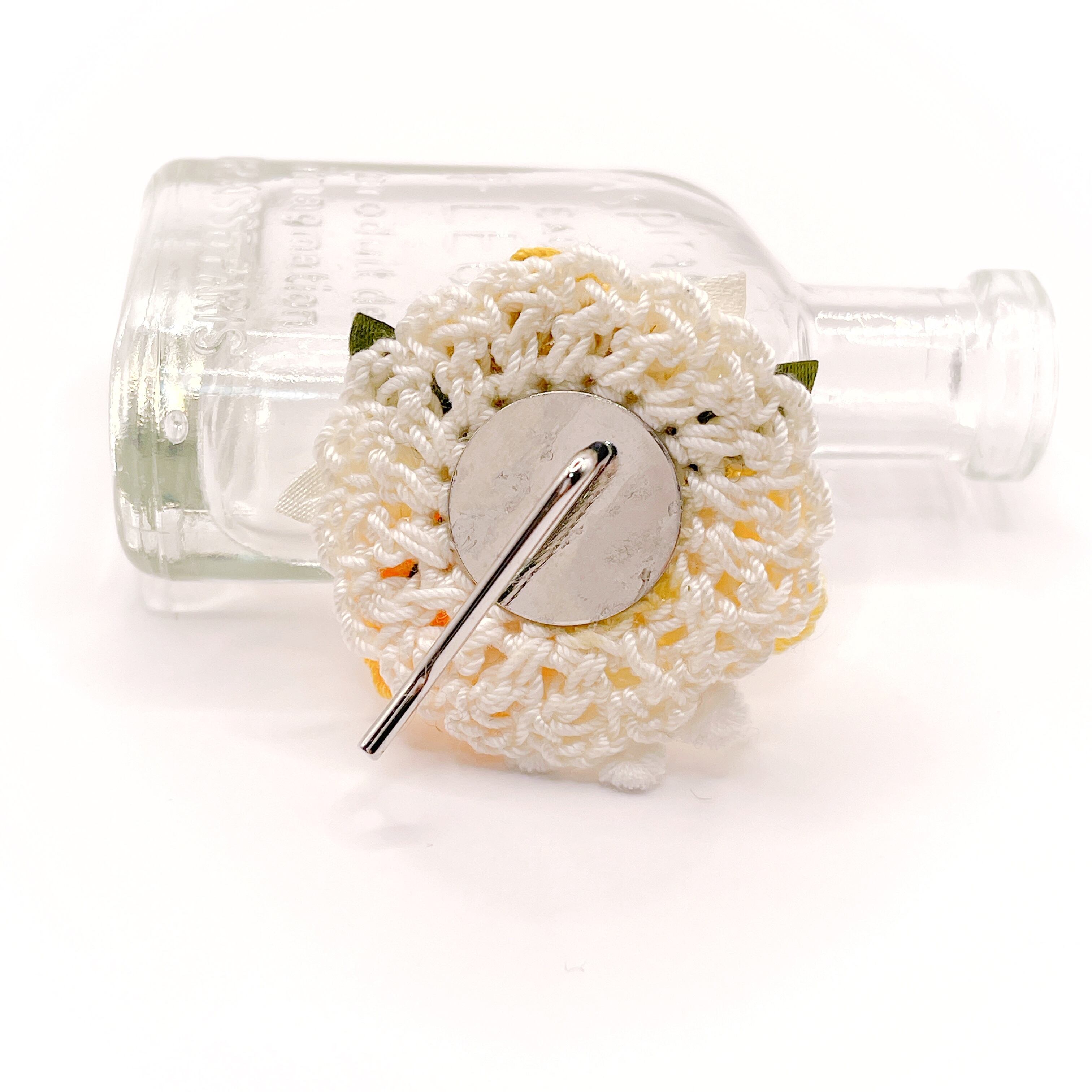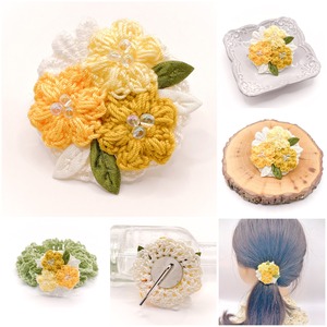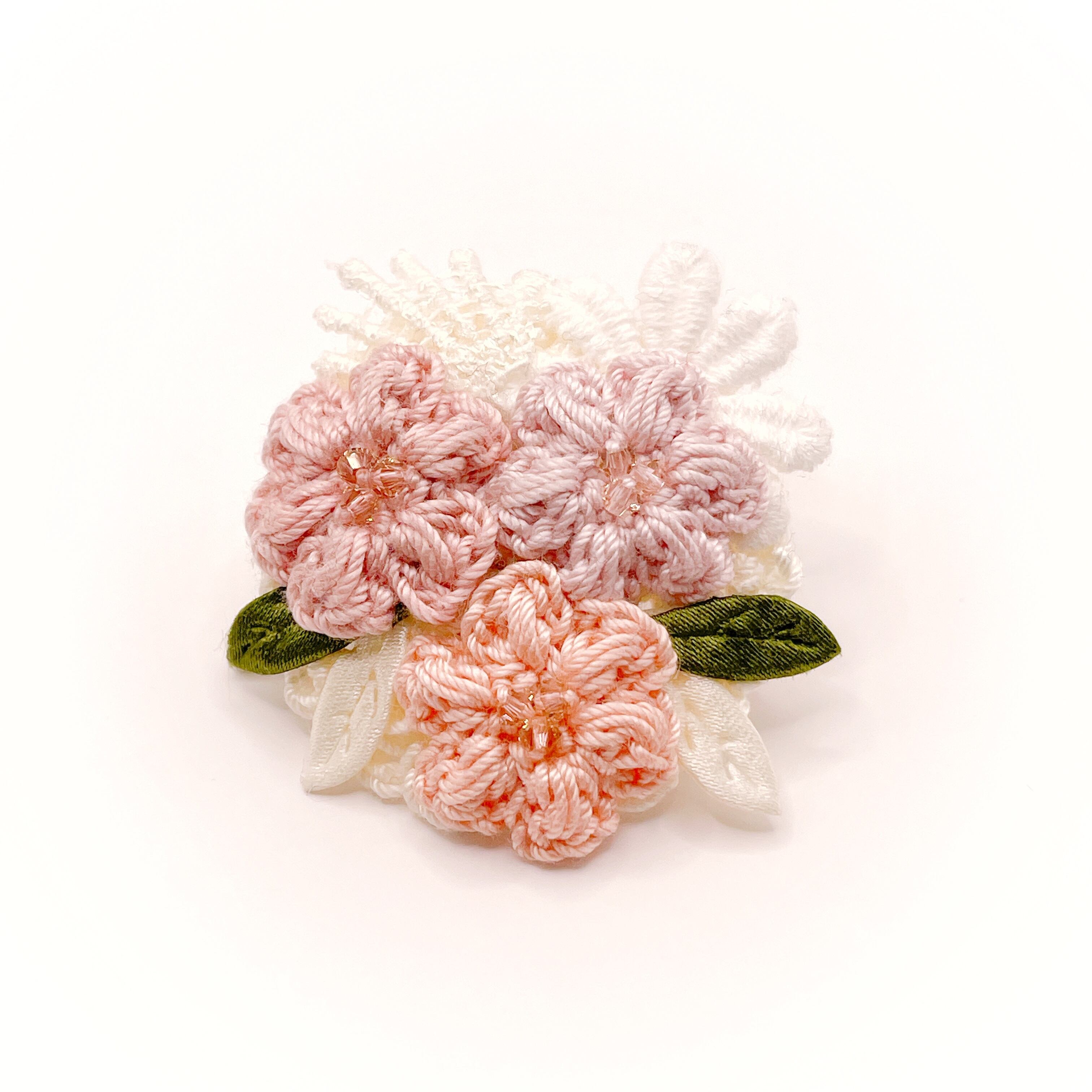 周囲にお花やリーフのレースを加え、手編みの丸い土台にまとめました。