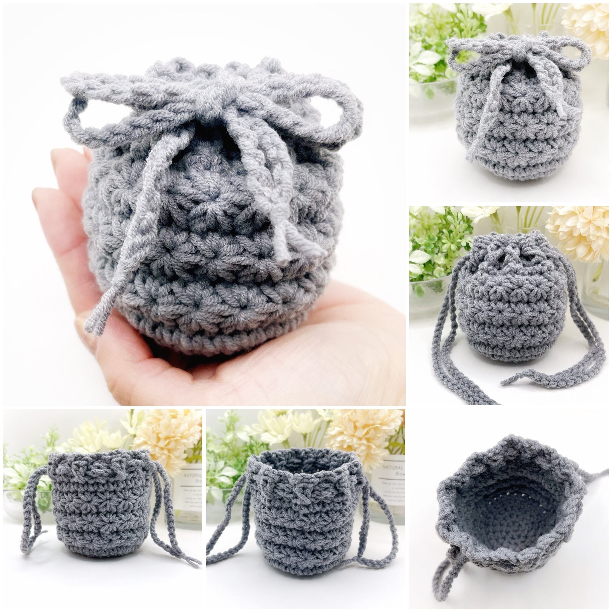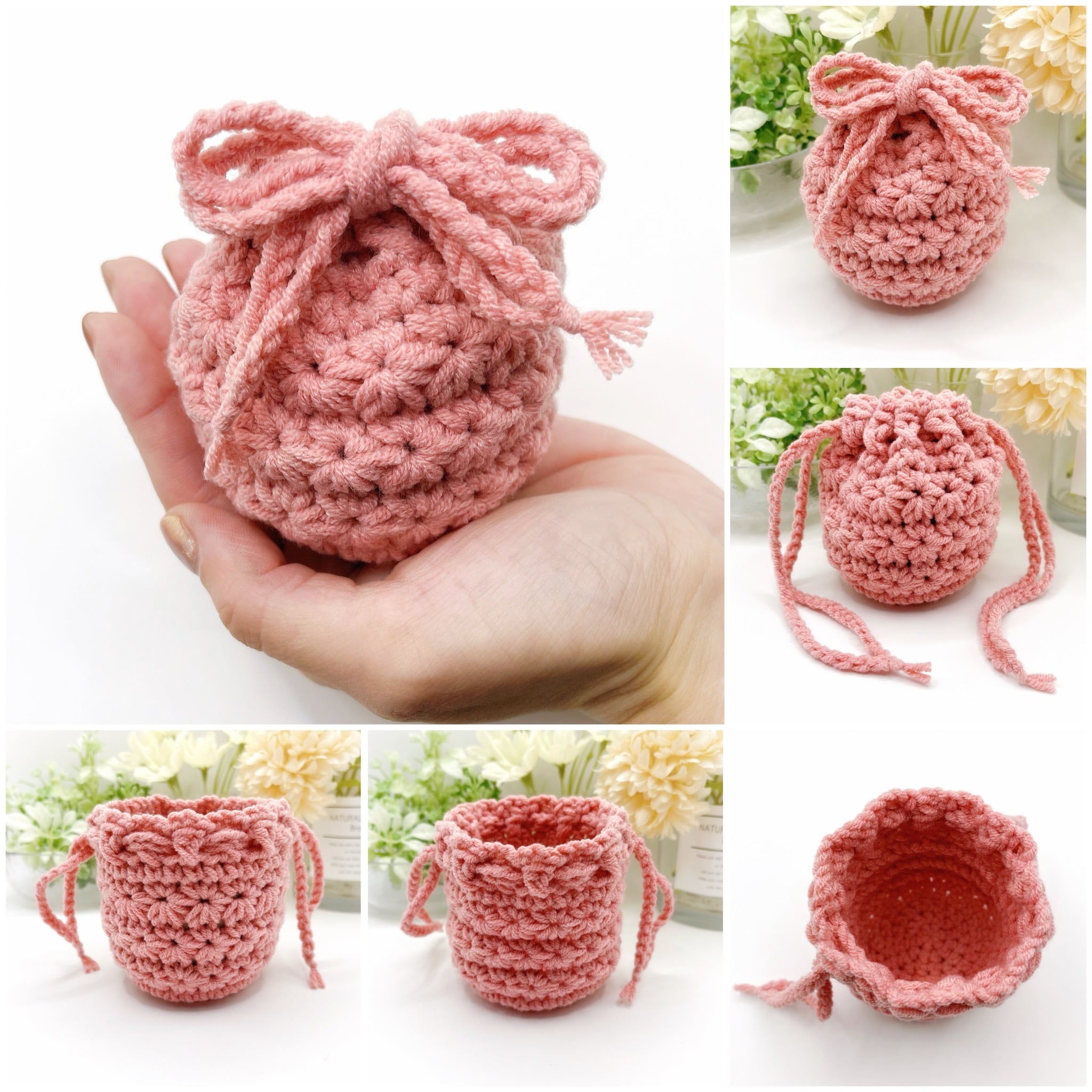 小さなお花が並ぶ編み模様が可愛らしい巾着袋です。