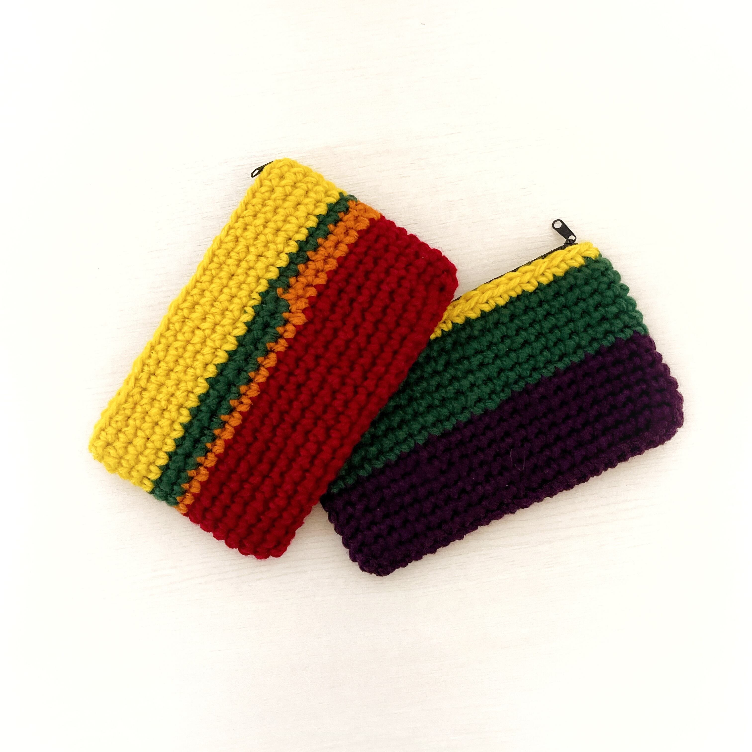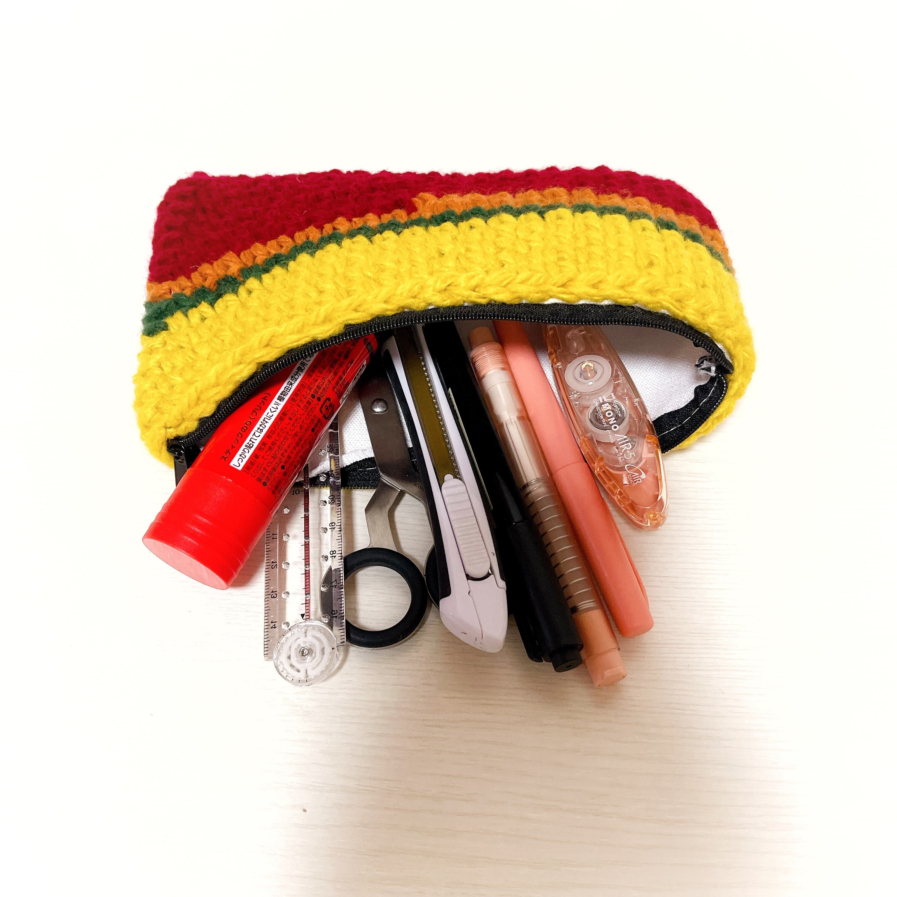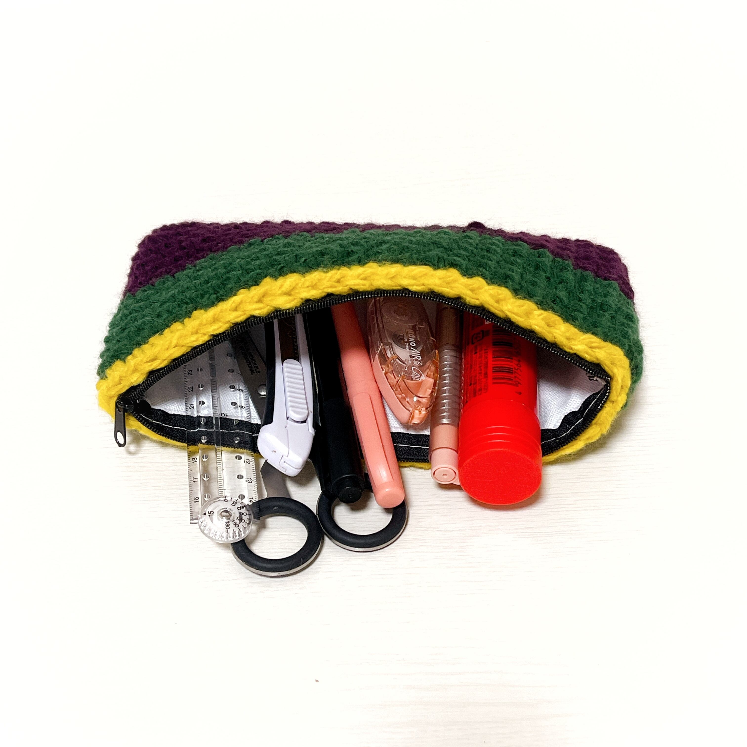 カラフルな毛糸で編んだ、冬の一点もののポーチです。