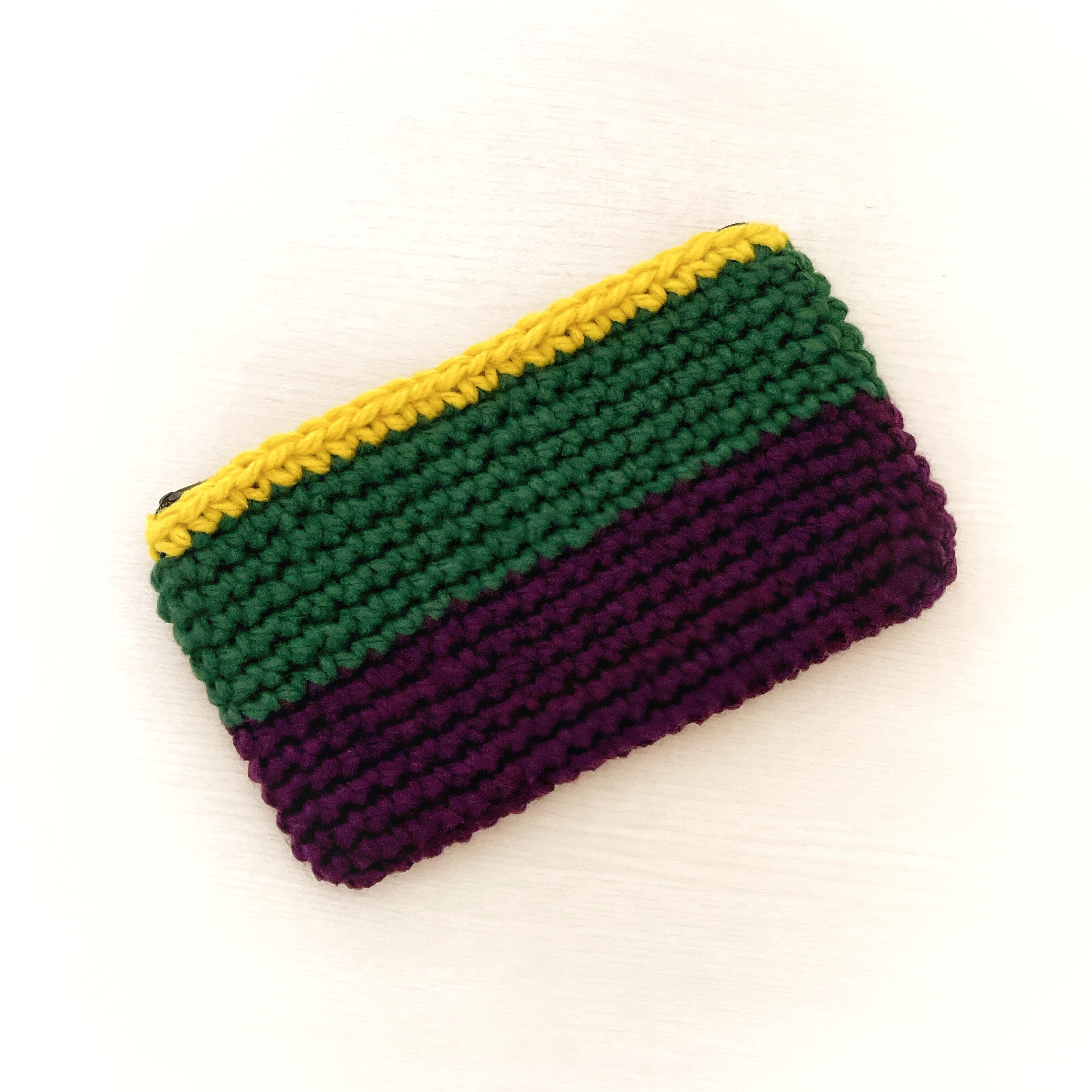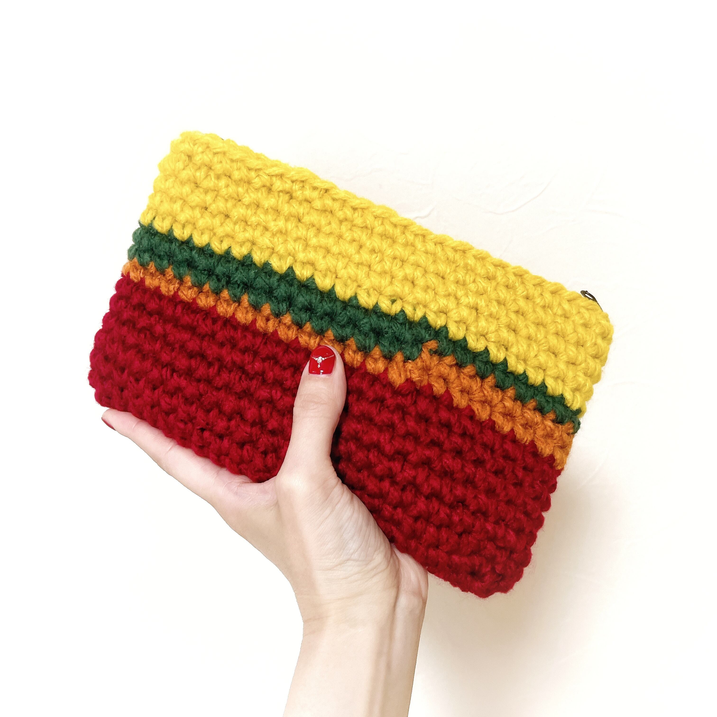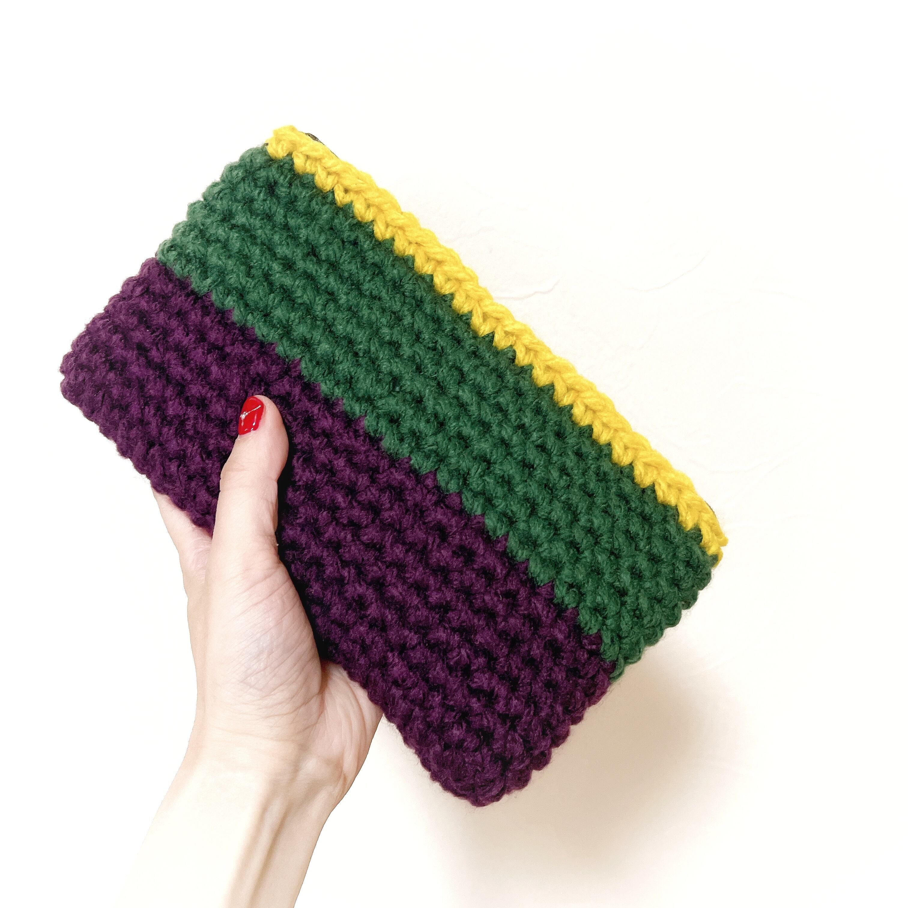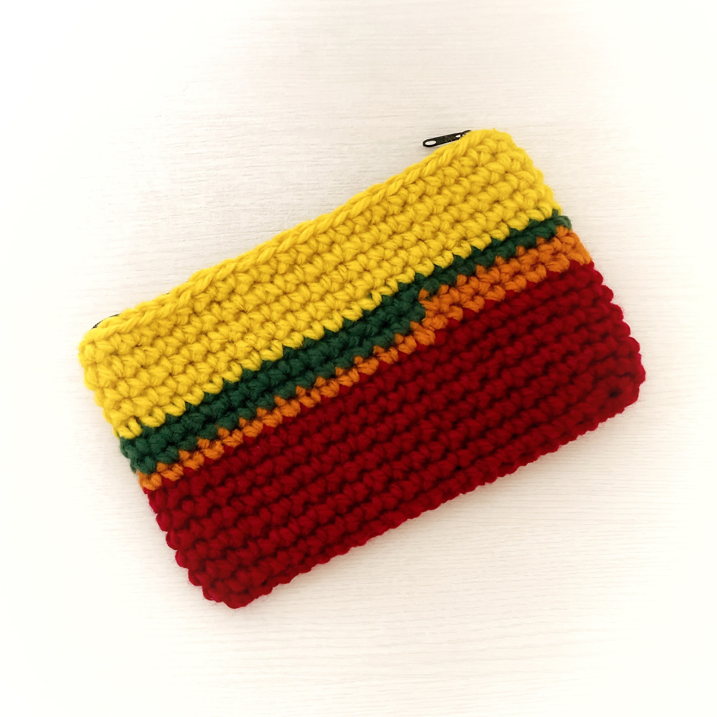 カラフルな毛糸で編んだ、冬の一点もののポーチです。