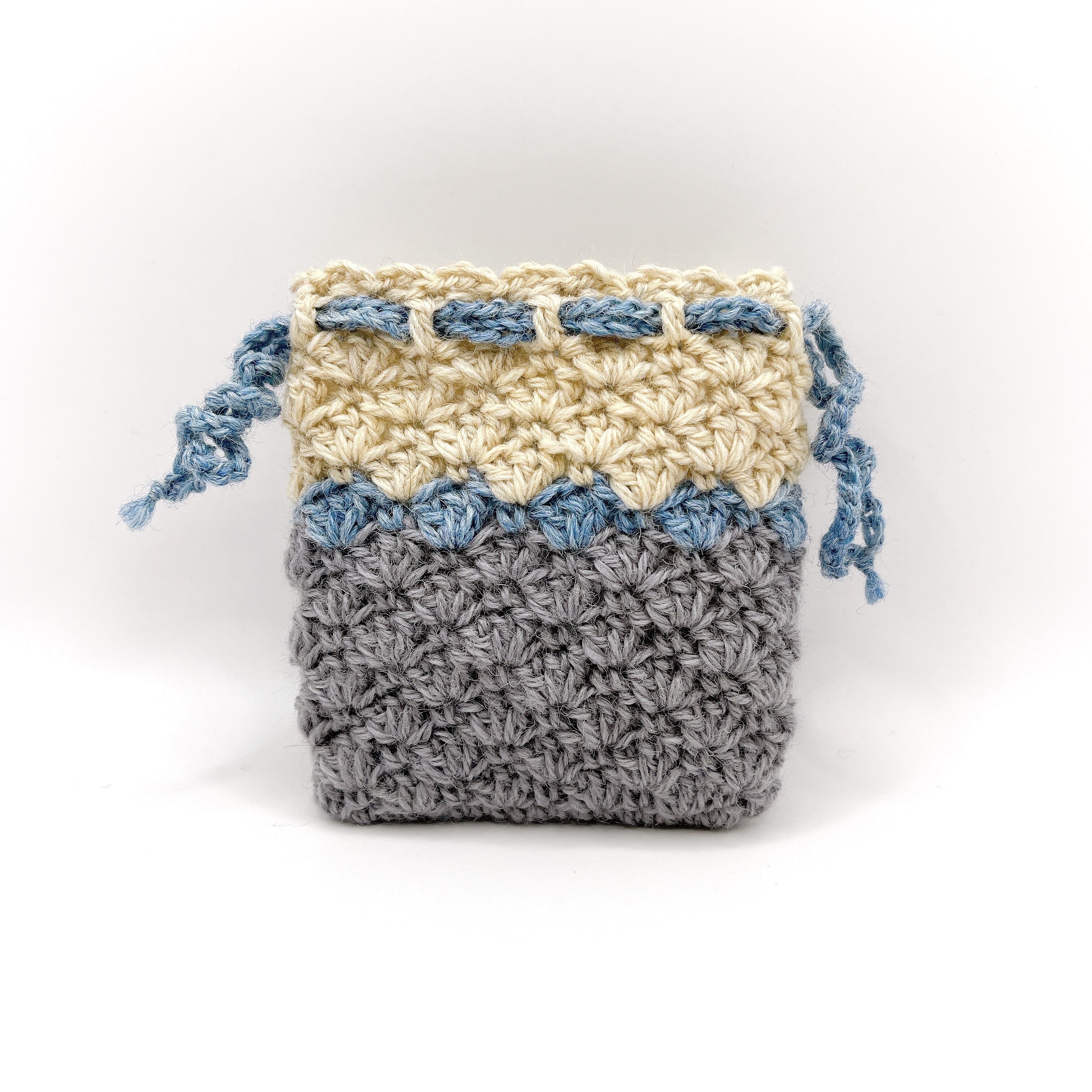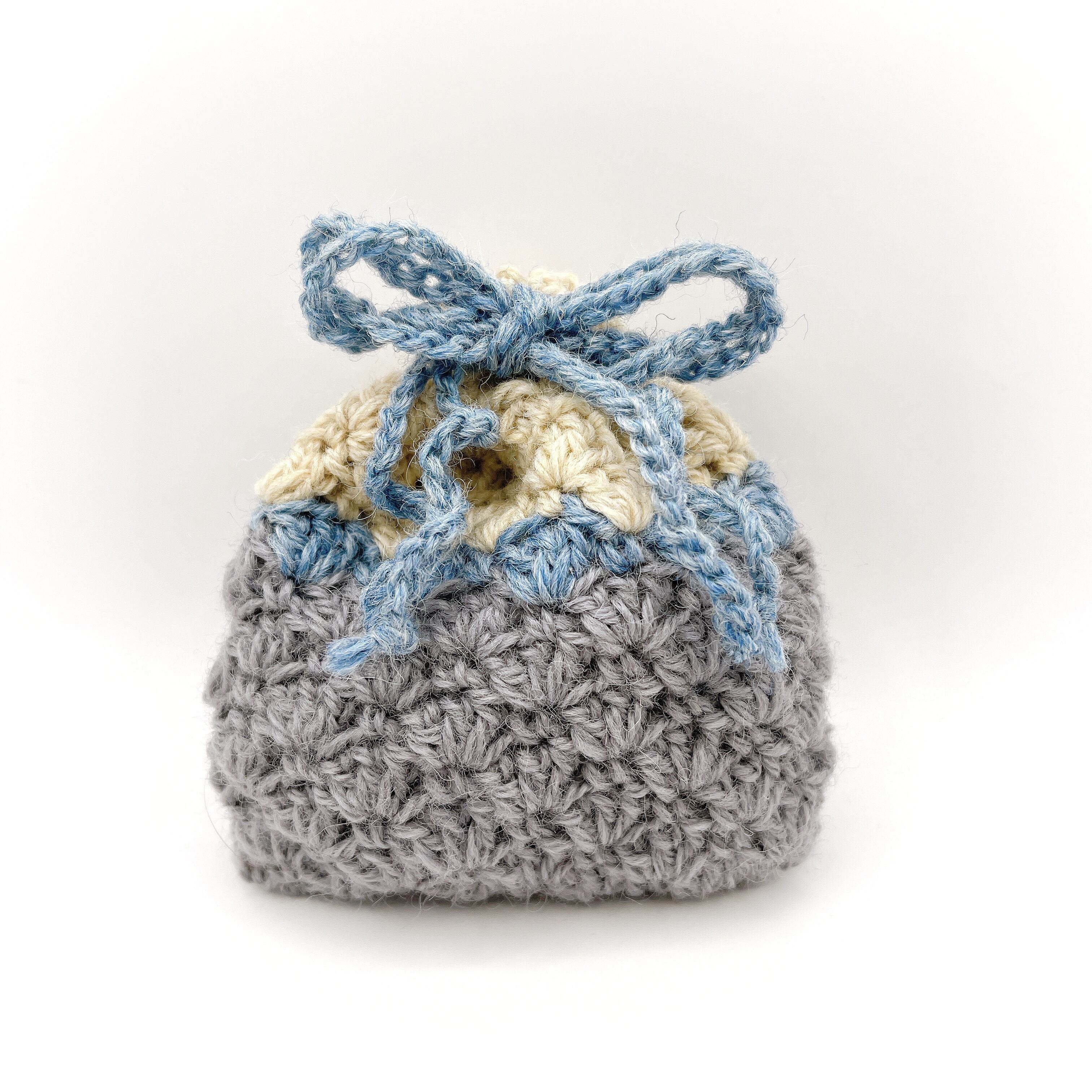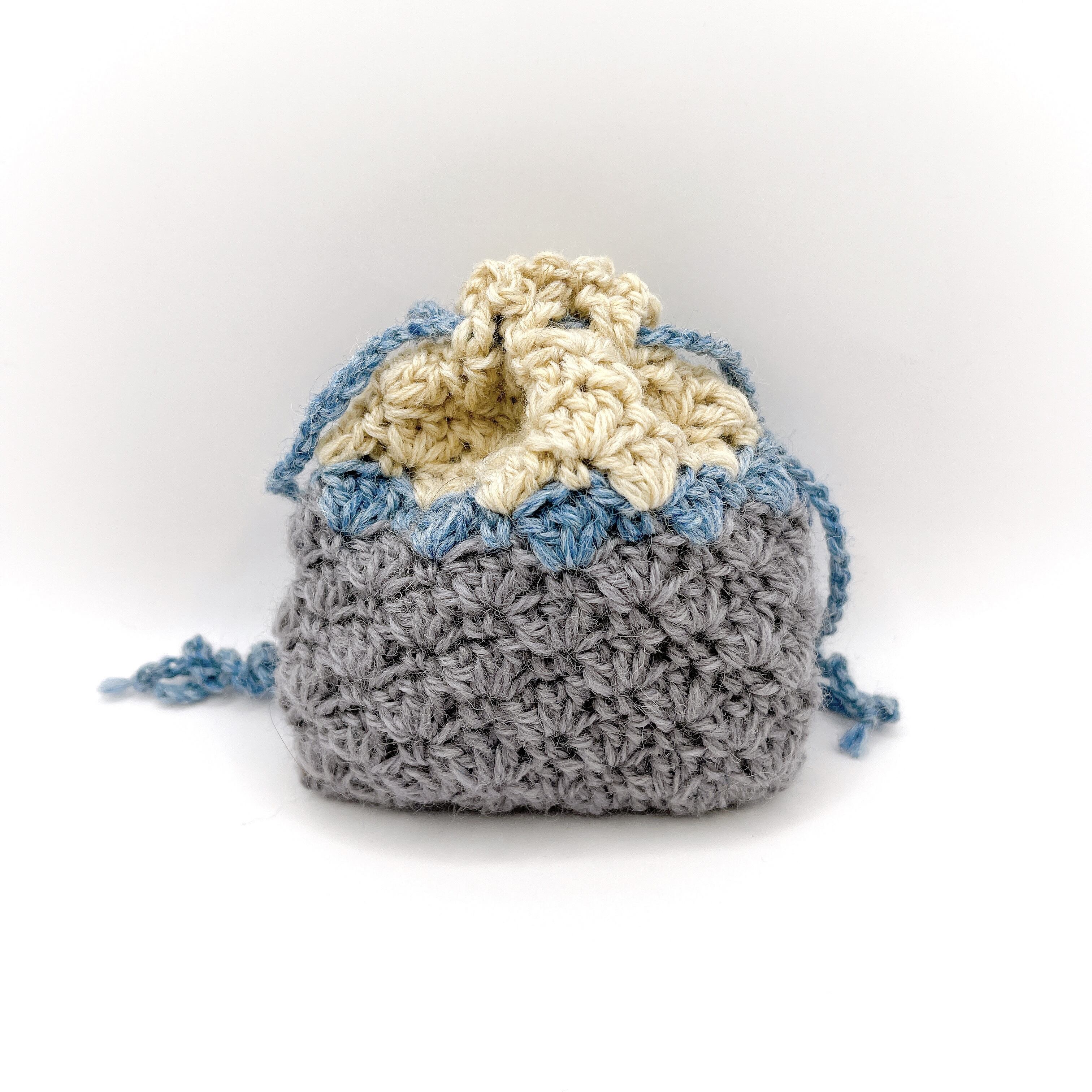 3色のウールで編んだ、巾着袋です。