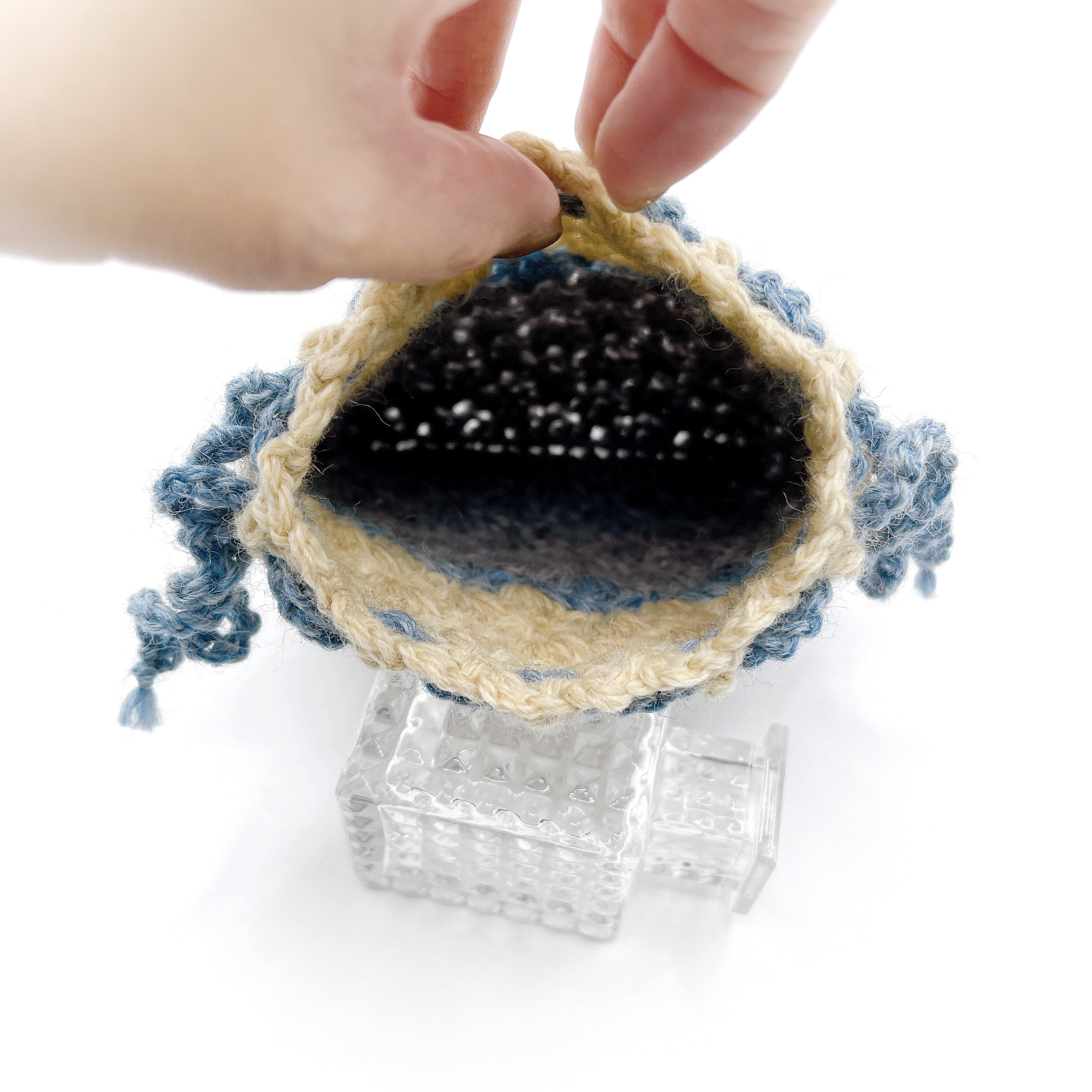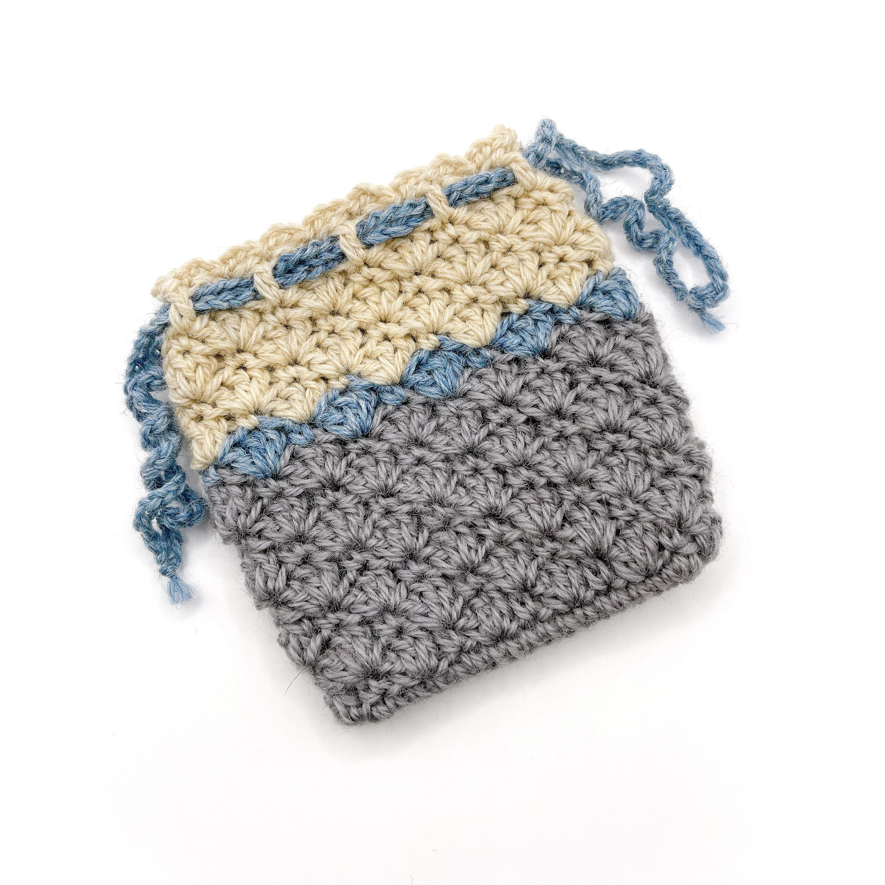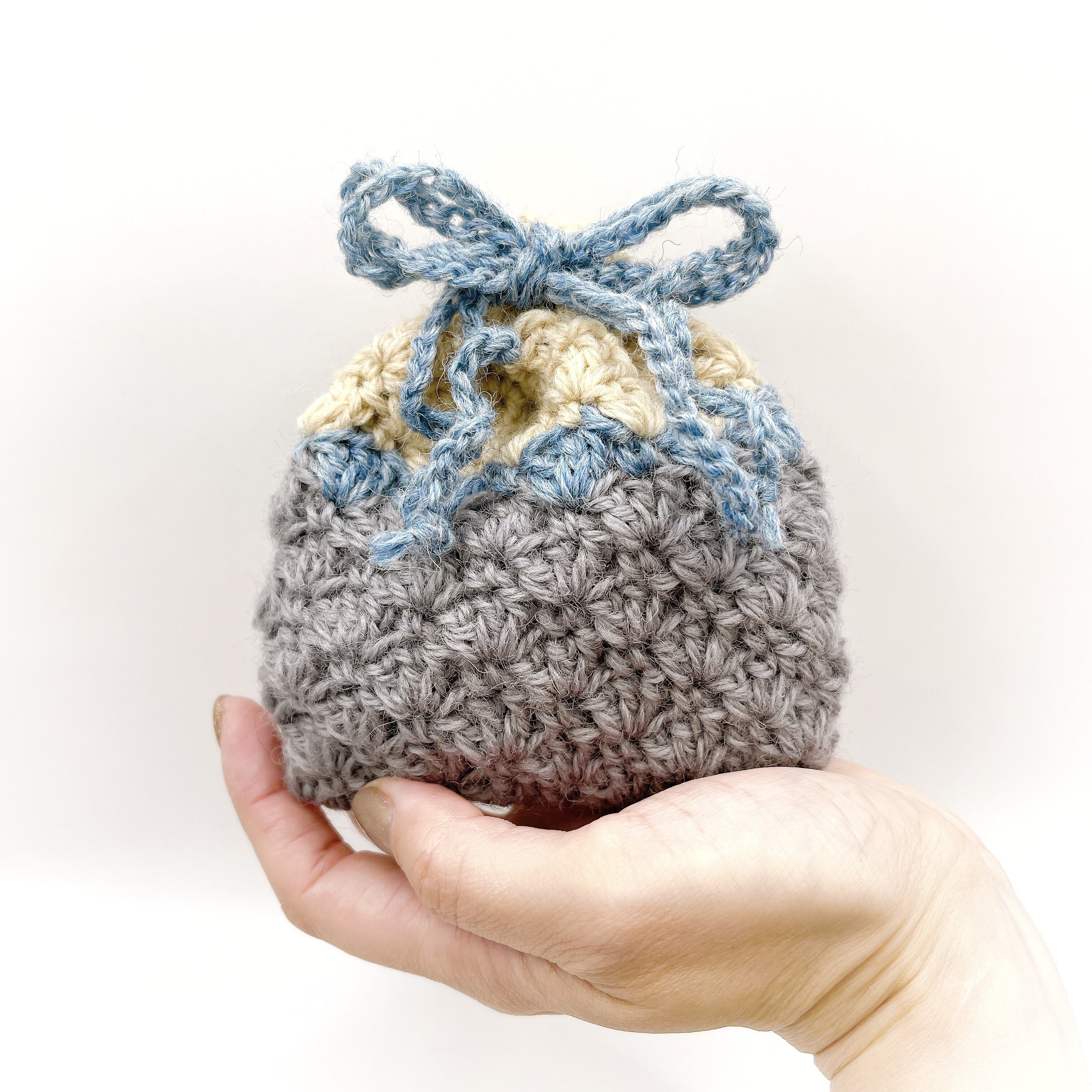 3色のウールで編んだ、巾着袋です。