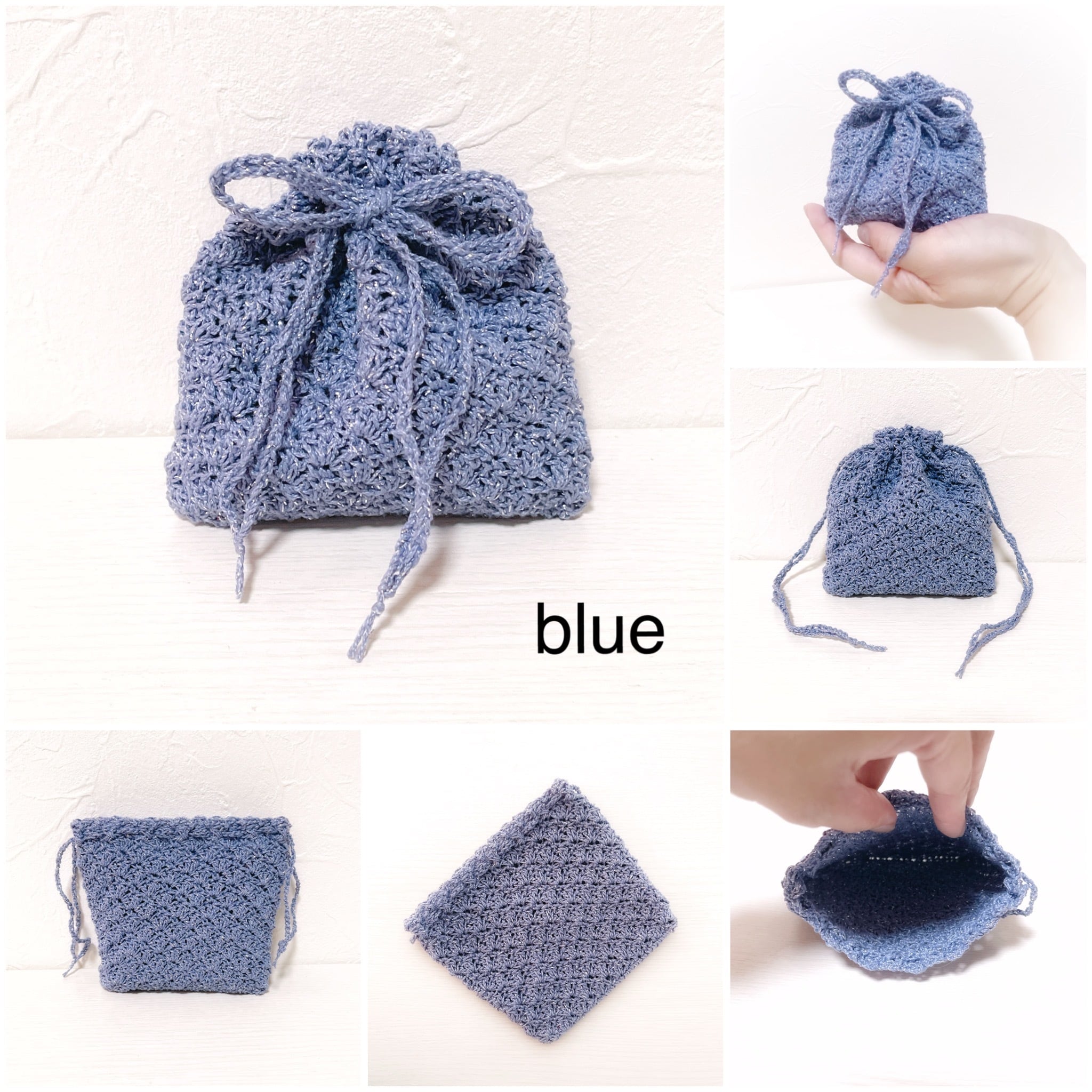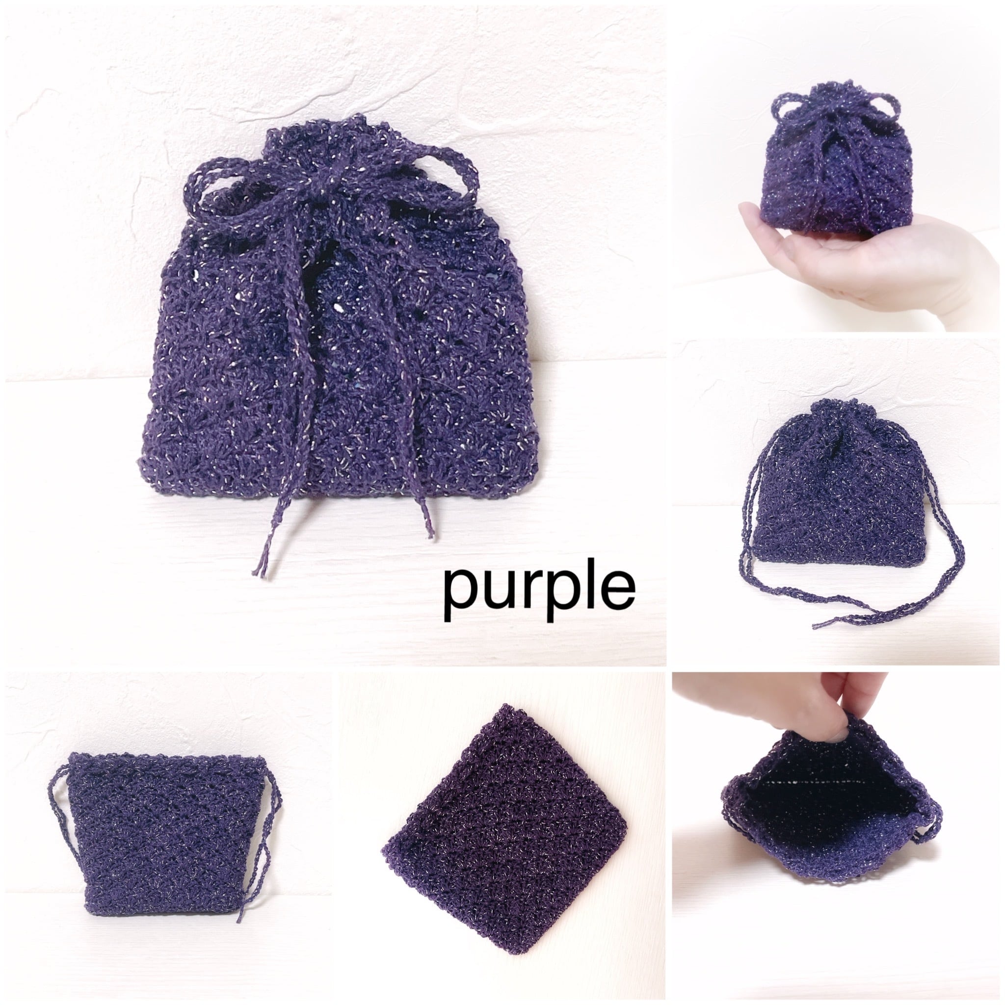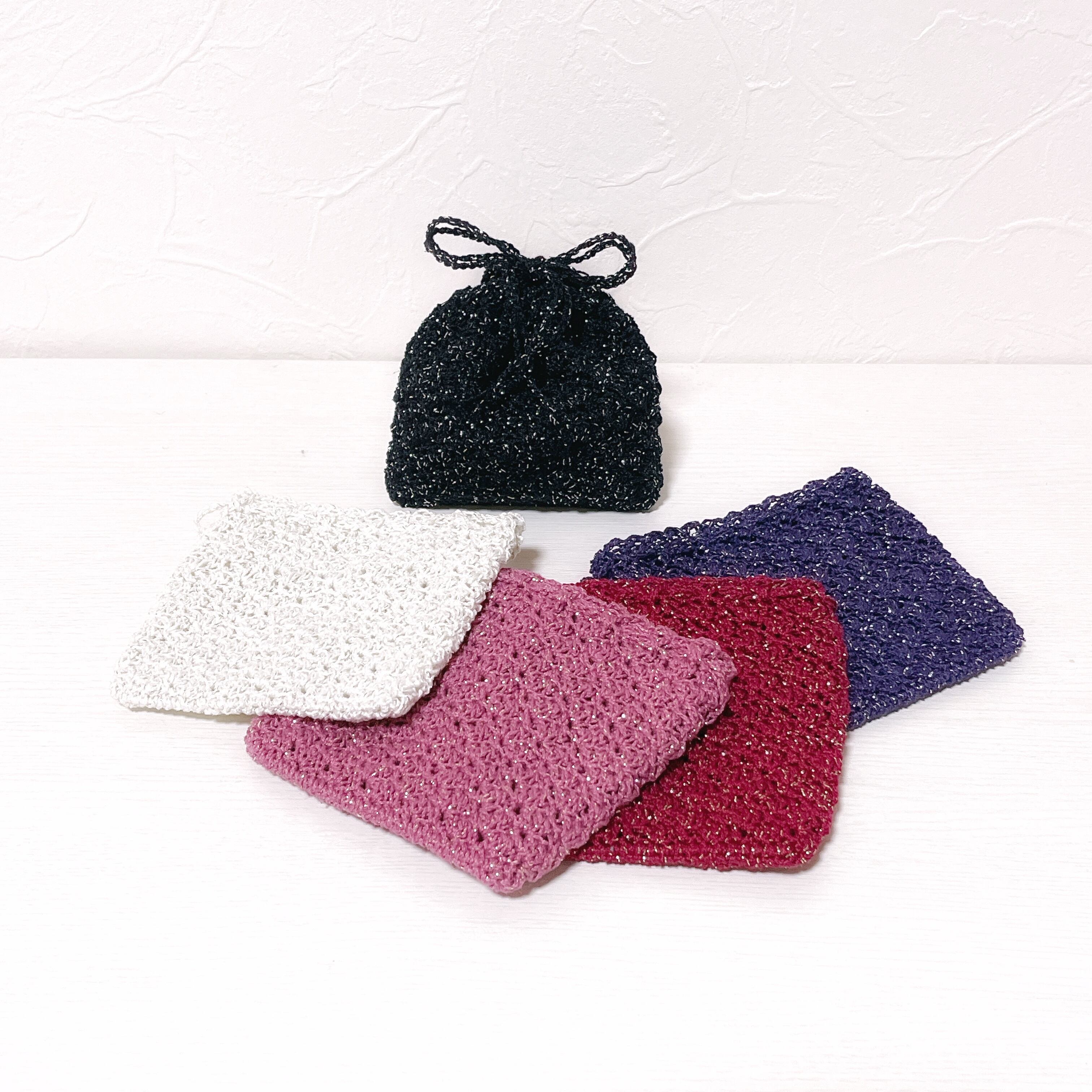 ラメがたっぷり入ったレース糸で編んだ巾着袋です。