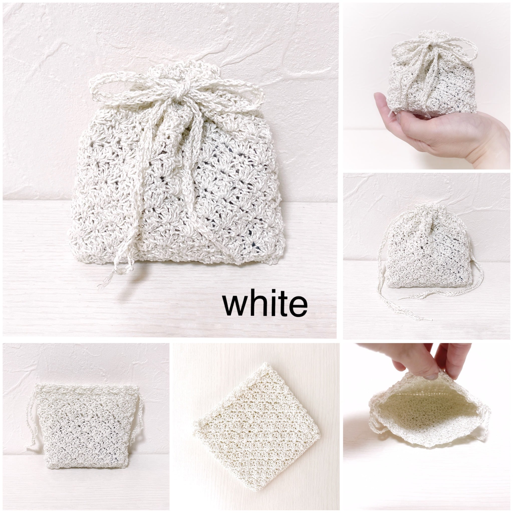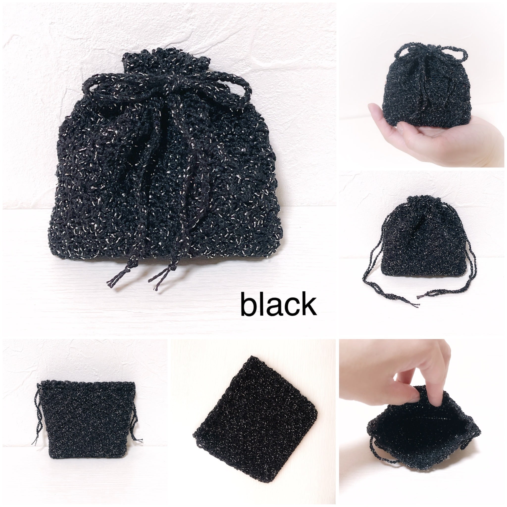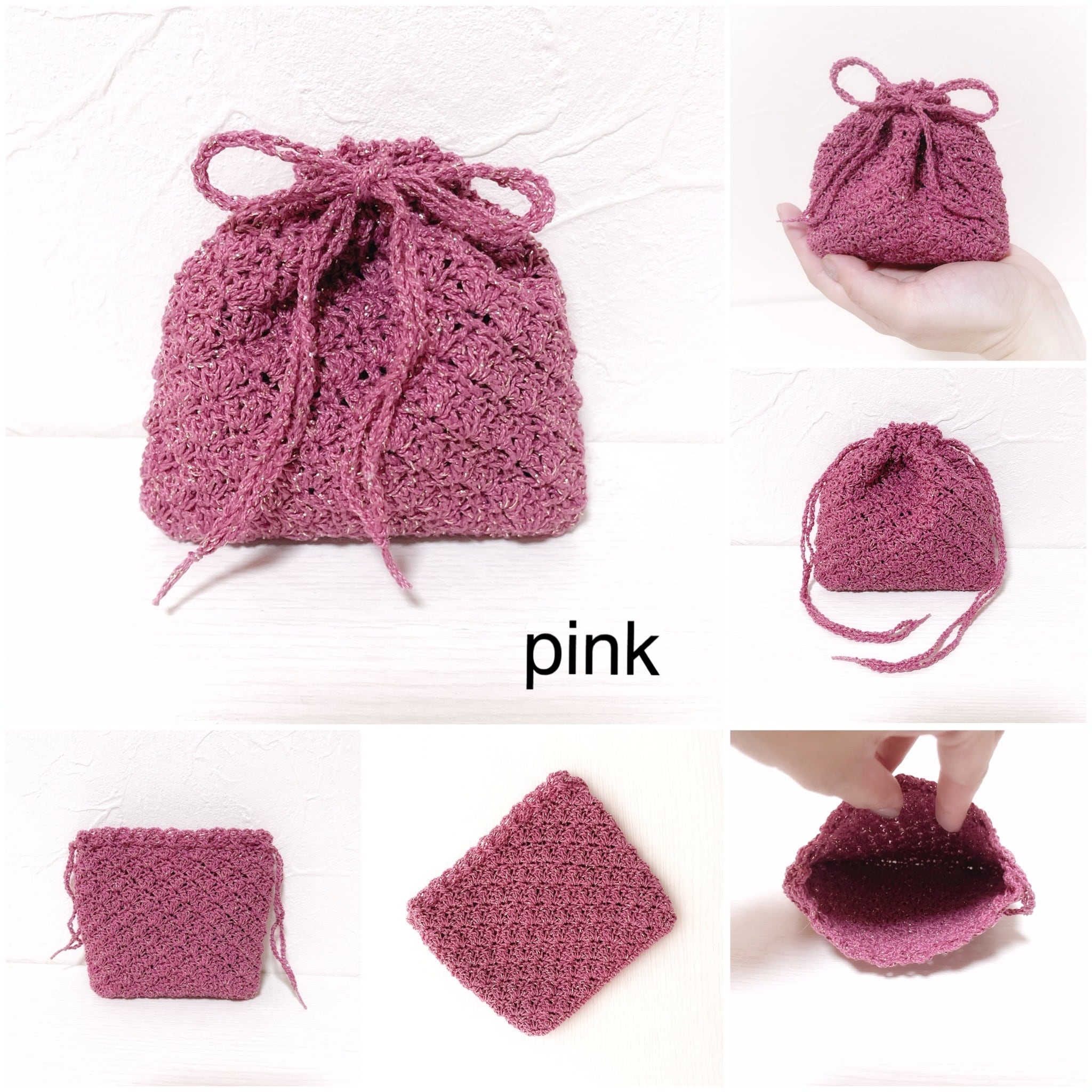 ラメがたっぷり入ったレース糸で編んだ巾着袋です。