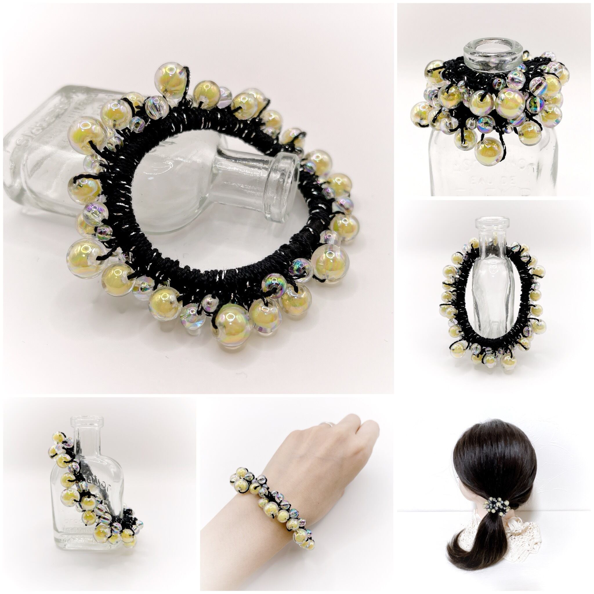 ラメ入りのレースで編み込んだビーズシュシュです。
