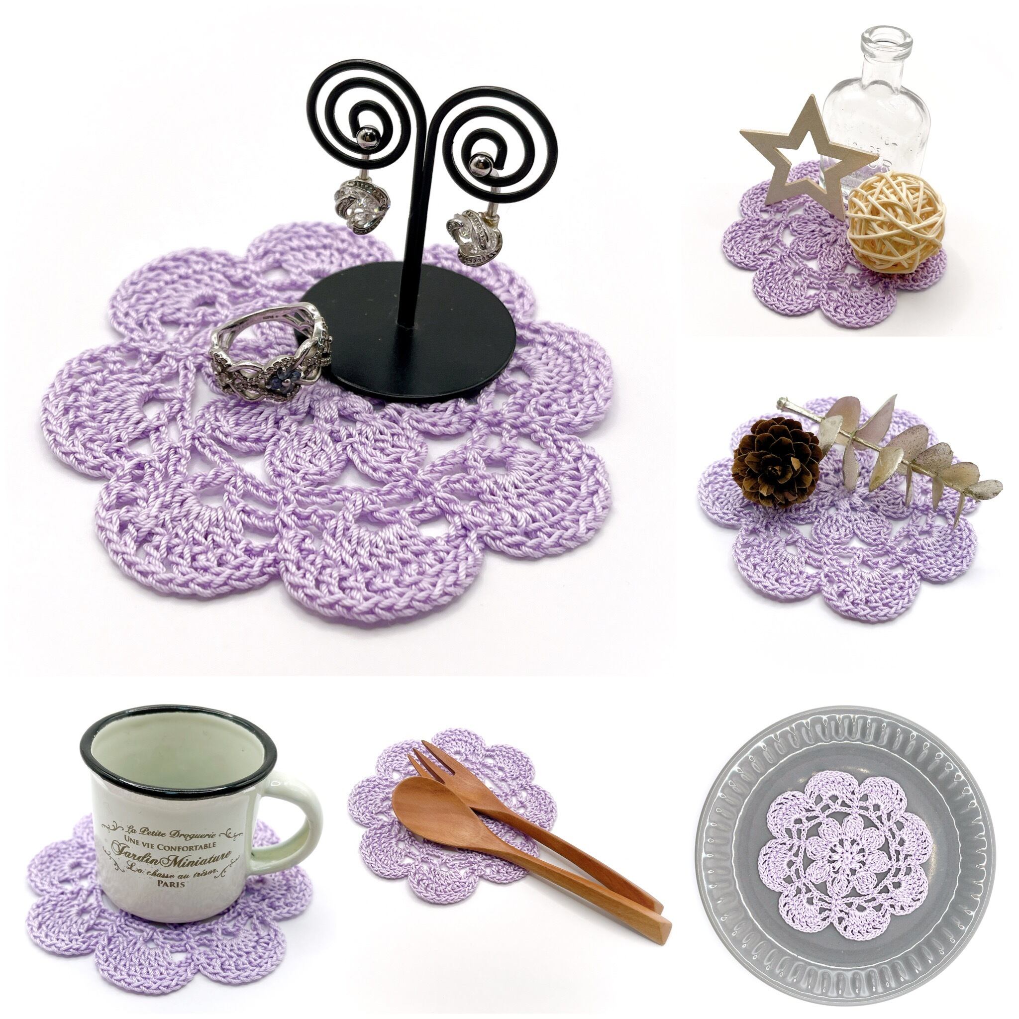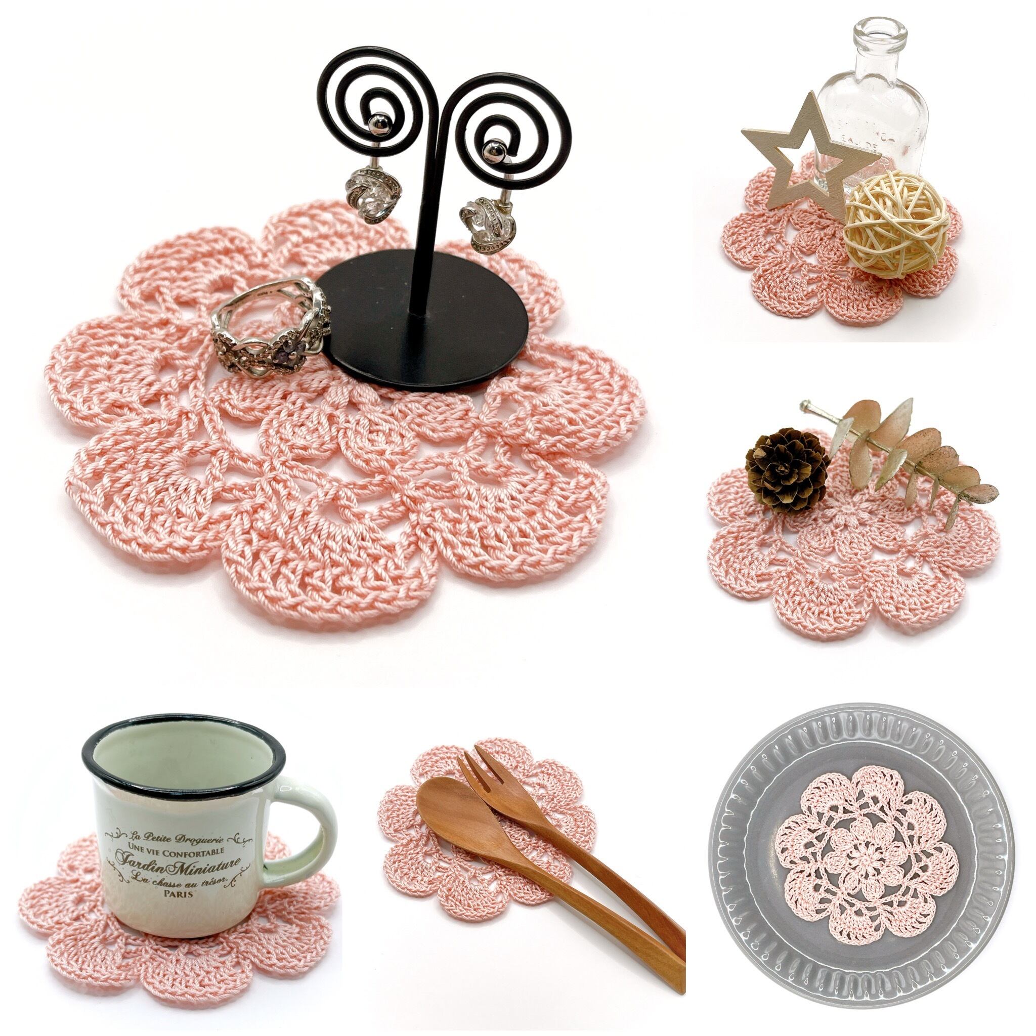 3つのお花の模様でできた、コースターにぴったりサイズのドイリーです.